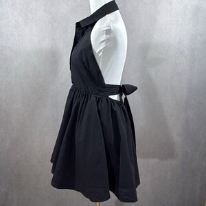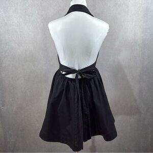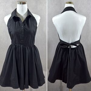 mini length dress halter neckline spread collar function buttons down front back tie close detail back elasticised waist band a-line skirt pull on design lined