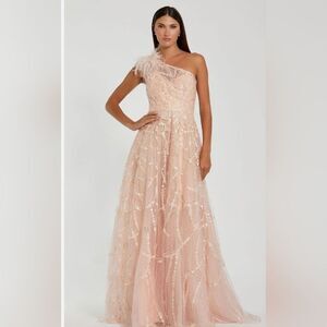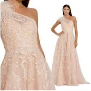 Mac DUGAL Elegant One-Shoulder Lace Dress with Feather Detail SIze 4 $798