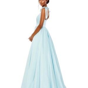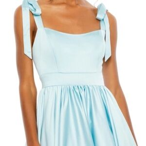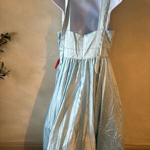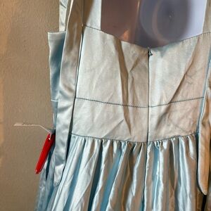 New with tags. Discoloration on front I think it’s a pull in the satin. Gorgeous dress otherwise prestine condition