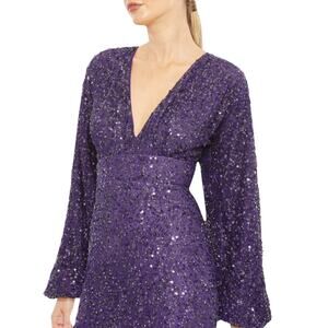 Riddled with shimmering sequins, this piece shows a low v-neckline with a ruche-ornate empire bodice