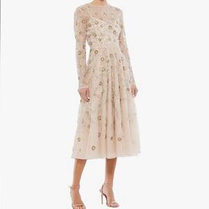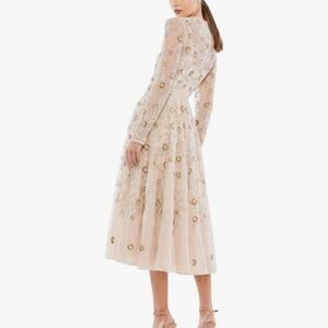 Wearing the Cocktail 10799 dress from Mac Duggal will enhance your appealing look. Beaded and floral embroidery was used to decorate the bodice, which is framed by long sleeves, a jewel neckline, and an exquisitely inserted V-lining that precisely matches the illusion effect on the neckline and back. The tea-length hemline of the pleated A-line skirt is visible. In this exquisite design from Mac Duggal, you'll be the absolute belle of the ball.