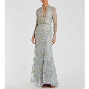 Mac Duggal 11165 Size 16 Light Blue Gold Long Sleeve Applique V-Neck Gown Dress