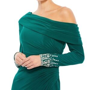 Off-the-shoulder long sleeve jersey gown accented with jeweled cuffs and a thigh-high slit.