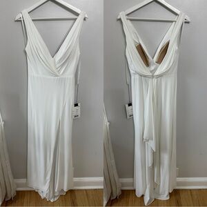 Sleeveless faux-wrap v-neck jersey gown featuring a plunging-v back, gathered sweeping train, and high front slit.