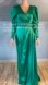 Mac Duggal 12404 emerald green mother of the bride dress features a softly ruched surplice bodice with a V-neckline, low V-back and puff long sleeves. A ruched cummerbund tops the pleated skirt, detailed with a thigh-high slit and a side overlay. This column-style satin gown exits with a sweep train.