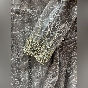 Chic midi dress with a wide v-neckline, sheer illusion sleeves, and jewel-accented cuffs