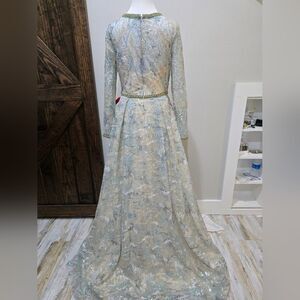 Details: Long Sleeves, Beaded Neckline and Cuffs, Embellished Waistband, Sheer Full Back, Concealed Zipper Closure, Sweep Train