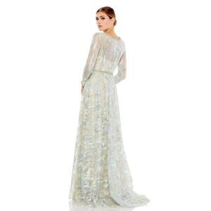 Mac Duggal 12460D platinum formal dress is crafted in sequin lace over a nude lining, jazzed up with crystal beadwork around the jewel neckline and waist. Semi-sheer long sleeves frame this A-line wedding guest gown, finished with a pleated skirt that flares to a sweep train.
