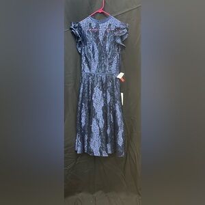 With a fitted bodice and tea-length A-line skirt, this darling embroidered dress is perfect for daytime soirées and after-5 events alike. The dress features short flutter sleeves, a high illusion neckline, and the dress' mesh overlay is adorned with allover embroidery and sequin accents. Tonal seam detailing accents the natural waist.