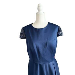 Tags: mac duggal, satin dress, embellished sleeve dress, blue tea length, formal gown, a line silhouette, high neck dress, elegant occasionwear, D0