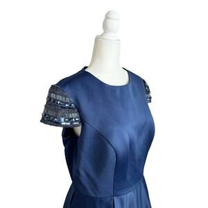 Refined and timeless, this Mac Duggal tea-length dress blends understated elegance with delicate embellishment. Crafted from smooth satin, it features a high round neckline, fitted bodice, and softly flared A-line skirt. Hand-sewn beaded and sequin detailing elevate the cap sleeves, creating a graceful look perfect for formal gatherings and celebrations.