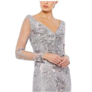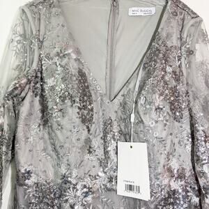 Brand new with tags NWT. Size 16 in platinum. There are some loose threads on embroidery throughout gown. Not damaged, just normal due to nature of the dress. One hanger strap is broken as shown in photo. Gown has red Mac Duggal return label with directions for easy at home removal prior to wearing. Will be packaged with care in a large USPS priority flat box. I have multiple Mac Duggals listed.