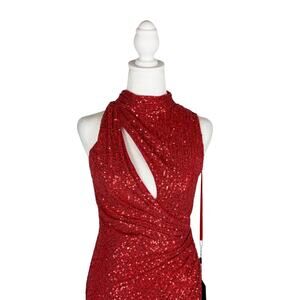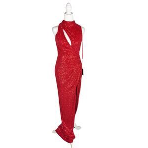 Crafted from dazzling sequins, this long, fitted column gown envelops you in shimmering sophistication, while the ruched detailing enhances your silhouette with graceful texture. The high neckline and sleeveless cut offer a modern, refined appeal, seamlessly complemented by a daring slit that adds just the right hint of allure. The discreet zipper back ensures a flawless fit, allowing you to move confidently through any black-tie gala or unforgettable evening event