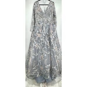 Mac Duggal { 20214 } Gray Long Sleeve Beaded Applique Gown [ 16 ]