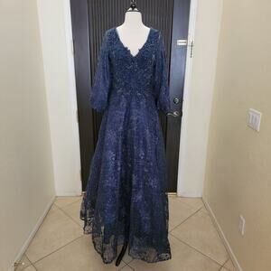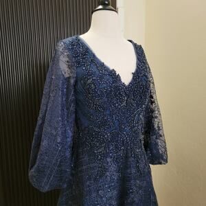 New With Tags Mac Duggal 20283 midnight navy formal gown in a floor-length maxi silhouette with elegant, refined detail. This long sleeve evening gown features a plunging V-neckline balanced by sheer puff sleeves for sophisticated coverage and a flattering, elongated shape. The embroidered mesh overlay is finished with all-over silver hand-sequined accents that add subtle shimmer without heavy shine.