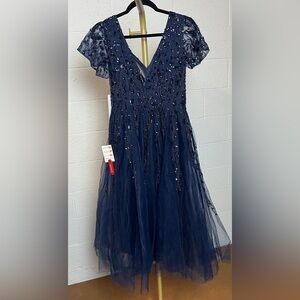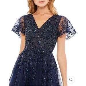 Elegant tea-length dress with semi-sheer short flutter sleeves and a flattering v-neck neckline. This dress has vertical beaded embellishment throughout the bodice and sleeve.