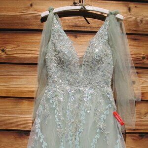 Mac Duggal 20313 Embellished Lined Mesh Gown Sleeveless Sage Green 0 NWT
