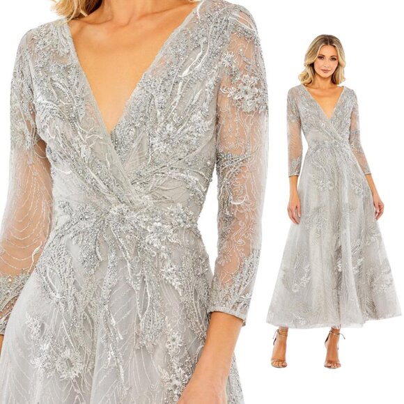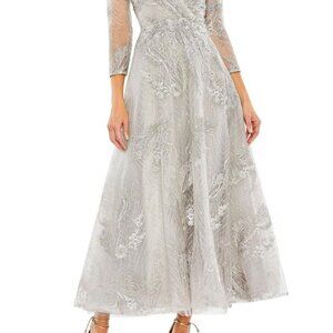 Mac Duggal 20336 Size 8 Silver Embellished Wrap V-Neck 3/4 Sleeve Midi Dress