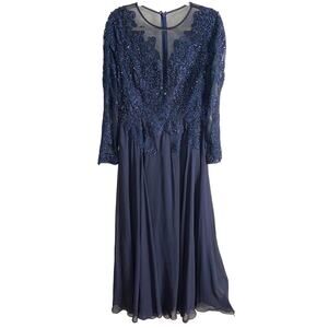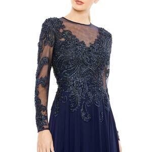 Mac Duggal 20385 Embroidered Beaded Jewel Neck Formal Dress Long Sleeve Blue 10
