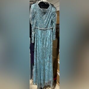 Mac Duggal 20442 aqua blue evening gown is styled in novelty beaded net, featuring a ruched surplice bodice with a V-neckline and illusion puff long sleeves. A beaded belt accents this slim formal dress, finished with a partial illusion back and a sweep train.