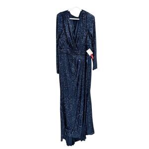 Long sleeved fully sequined evening gown accented with a ruched waist and thigh-high front slit.