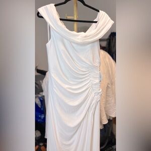 Foldover off-the-shoulder jersey gown with a flattering ruched bodice and a thigh-high slit.