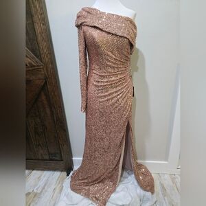 Mac Duggal 26571 Copper Pink Sequined Drop Shoulder Faux Wrap Gown NWT Sz 8