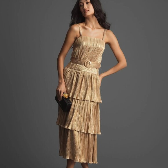 Get ready to shine in this tea-length metallic party dress 27062 from Mac Duggal. Crafted in gleaming pleated luxe metallic fabric from the square neckline to the midi-length hem, this tea-length cocktail dress is ready to elevate your evening look for wedding receptions, galas, and other semi-formal events. The beautiful metallic midi dress has a wide belted waist that tops the tiered skirt that flows to mid calf in a figure-flattering a-line shape. Offered in misses and some plus sizes, this tea-length metallic party dress is a modest yet eye-catching choice for your celebration.