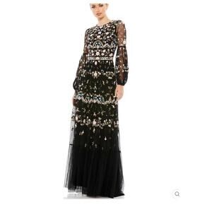 Elevate your evening look with this stunning Mac Duggal embroidered gown. This statement piece features an illusion mesh overlay with intricate pastel floral embroidery in pink, blue, and cream. The long sheer sleeves, cinched waist, and flowing layered skirt create an elegant silhouette perfect for formal events, galas, weddings, or red-carpet moments.