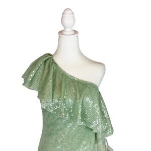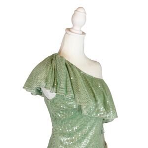This cocktail dress features a fitted silhouette in allover sequins, with sash-inspired ruffle trims around the one-shoulder neckline.