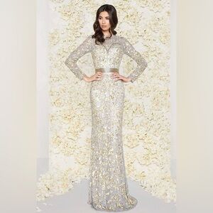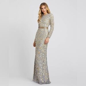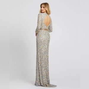 NWT Mac Duggal Long Sleeve Beaded Formal Black Tie Evening Gown Platinum Gold (a bluish-gray) Light up the ballroom at your black-tie event with pure luminous grace in this elegant Mac Duggal Couture 4316D creation. Designed with a trailing vine embellishments festooned in glistening sequins and beads on meshed lace, this beauty shows off a jewel illusion over a sweetheart neckline with slim long sleeves. With a circular open back, this stunner is handsomely cinched with a wide glimmering band. Exceptional sheath skirt in lace flows down divinely to complete at a full-length hem and a subtle brush of train. Showcase your inner brilliance and alluring style in this glamorous Mac Duggal masterpiece. Model is wearing the Platinum/Gold.