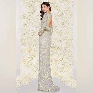 Mac Duggal 4316D Long Sleeve Beaded Formal Black Tie Evening Gown Platinum Gold