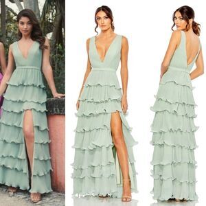 Mac Duggal 49054 Size 6 Sage Green Sleeveless Ruffle Tiered V-Neck Gown Dress