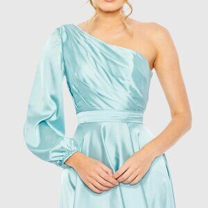 Mac Duggal 49141 Blue Long Sleeve One Shoulder Satin High Low A-line Gown