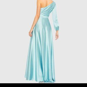 The Mac Duggal 49141 Blue Long Sleeve One Shoulder Satin High Low A-line Gown is a sophisticated and elegant dress designed for formal occasions or parties. Made from luxurious satin fabric in a solid blue color, this gown features a flattering A-line silhouette with a high-low hem, long sleeves, and a one-shoulder neckline. The dress has a zipper closure and is lined for added comfort and quality. Perfect for all seasons, this gown from the renowned brand Mac Duggal is a versatile and stylish choice for any event.