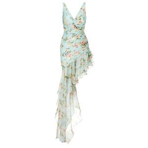 Sleeveless floral print chiffon dress with a v-neckline, ruched bodice, and an asymmetrical ruffled waterfall hem.