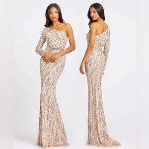 New with tags. Mac Duggal EMBELLISHED ONE SLEEVE SEQUIN GOWN. Rose Gold / Pink. Style number 4982.