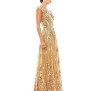 DESCRIPTION Floor-length evening gown cascading sequin stripes, exquisite 3D floral embellishments at the shoulders and bottom hem, and a sweeping A-line hem. Mac Duggal Sequin Fabric (100% polyester) Fully lined V-neck Cap sleeve 3D Floral embellishments Concealed back zipper Approx. 62.5" from top of shoulder to bottom hem Available in Champagne Style #5223