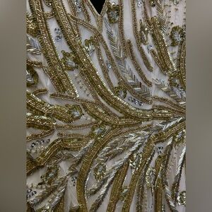 Stunning gown with allover leaf-patterned embellishment, a plunging illusion v-neckline, and an elegant train.