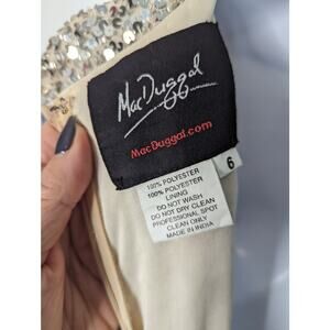 Dazzling and elegant, this Mac Duggal gown features an ombre silver sequin design that catches the light with every movement. The fitted sheath silhouette and slit front create a sophisticated, show-stopping look perfect for galas, weddings, or black-tie events. Classic Mac Duggal craftsmanship with a timelessly glamorous finish.