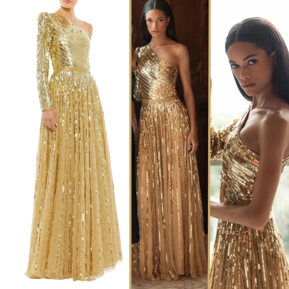 Mac Duggal 5508 Size 16 Gold One Shoulder Sequined Beaded Long Maxi Gown Dress