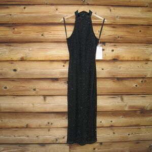 Chic high-neck halter midi dress with diamond-patterned beading throughout the overlay. This midi sheath dress features a back zipper and back center slit.