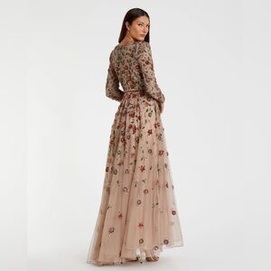 This embellished gown is a breathtaking blend of elegance and glamour. With its high neckline, long sleeves, and allover embellishments, its the perfect gown for evening affairs and black-tie events.