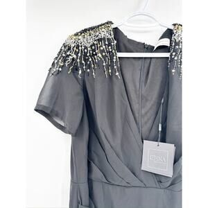 Inspire people to adore you in this sultry Ieena Duggal 55704 creation. Featuring fine ruching on a surplice bodice, this dress flaunts a deep v-neckline with short sleeves and striking embellishments on shoulders. Gathering at one side while parting with a side slit, the sheath skirt tailors into a full-length hemline with a train.