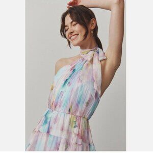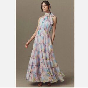 This gown is a stunning statement piece for your next event. Adorned with a vibrant floral print, this gown boasts a unique asymmetrical halter neckline that adds a touch of modernity. The tiered design adds depth and movement, creating an elegant silhouette that's perfect for formal occasions.
