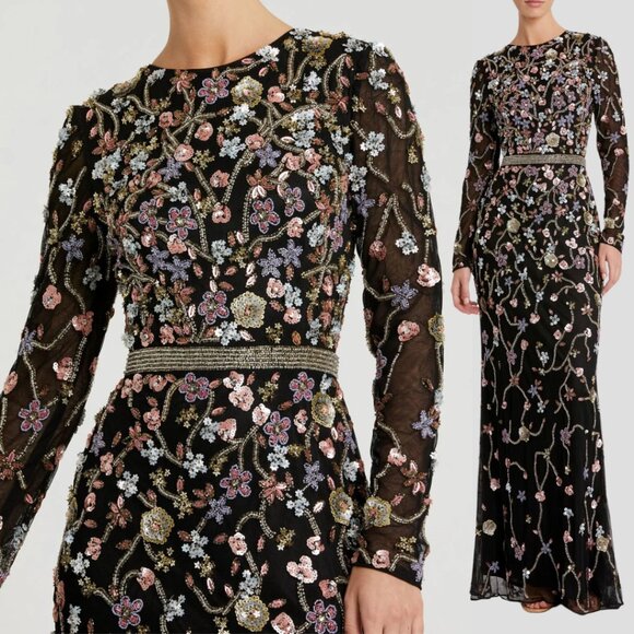 Mac Duggal 6135 Womens Black Floral Long Sleeve Embellished Mesh Gown Maxi Dress