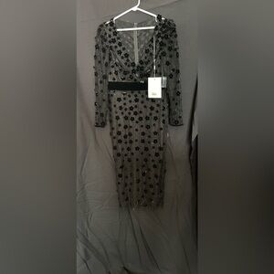 Mac Duggal 66856 NWOT EMBELLISHED V NECK ILLUSION LONG SLEEVE COLUMN MIDI