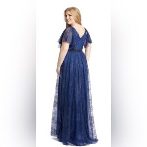 Elegant blue gown with lace overlay and V-neckline. Ideal for formal events