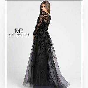 Mac Duggal 67502D black evening dress is crafted in soft net over a solid lining, with a low V-neckline, illusion long sleeves, and partial illusion back. Beaded 3D floral appliques richly embellish this A-line mother of the bride gown, finished with a velvet set-on waistband and a sweep train.