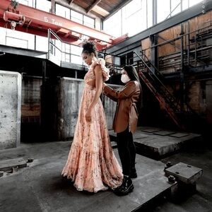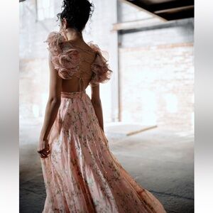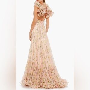 New with tags! Mac Duggal Floral Chiffon Cutout Ruffle Shoulder Ball Gown Maxi Dress. Size 8. As seen on @champagneandchanel Emily Travis for her Engagement photo shoot. Also seen on Dakota Fanning in the first episode of “The Perfect Couple” on Netflix. This dress is very highly sought after! Peachy floral.